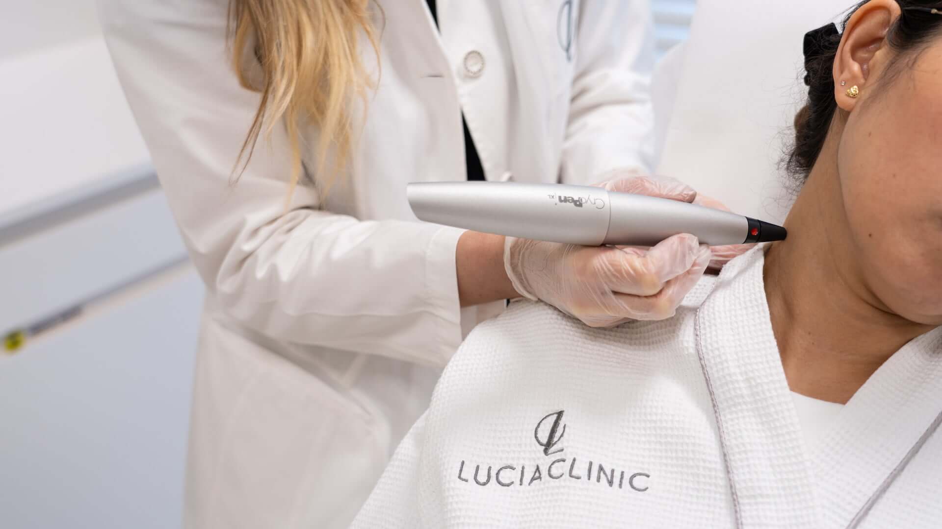 CryoPen works by using the technology of cryotherapy, where cryo means extremely cold. During the treatment, a high-pressure jet of nitrous oxide is directed to the targeted lesion with millimeter accuracy. Nitrous oxide provides cold energy. This source of cold eliminates unwanted skin tissue without damaging the surrounding healthy tissue.